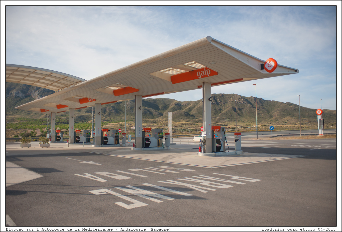 A peine avons nous passé le panneau "Andalousie" que nous nous arretons pour la nuit. L'objectif du voyage est atteint, on va pouvoir quitter les autoroutes et commencer à se balader ! Je suis très surpris (favorablement) du confort du Trafic question avaler des kilomètres, moi qui ai toujours voyagé dans de belles voitures... Nous passons la nuit dans une vaste station essance de l'Autoroute. Nuit très tranquille.