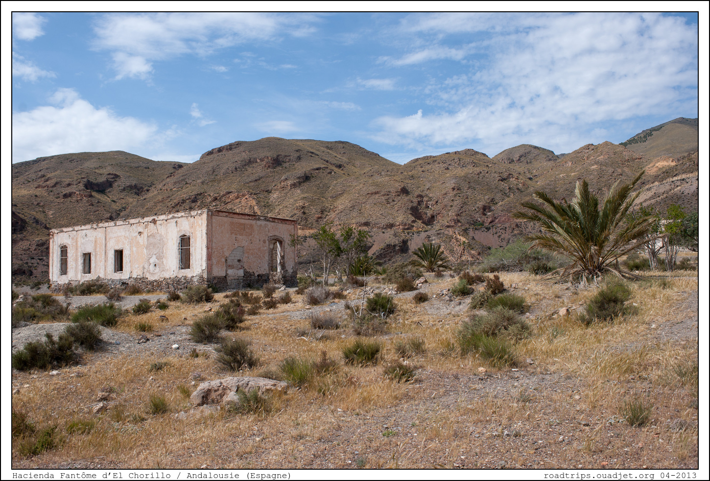 Dans l'après midi, on s'éssaie un peu à la piste en terre. J'ai lu que le Trafic, bien que simple deux roues motrices, est pas trop mauvais dans cet exercice. Après une descente assez raide on j'étais pas trop rassuré, on tombe sur une hacienda à l'abandon. L'occasion de croiser un berger autochtone, très sympa, mais parlant un langage totalement inconnu (de l'Andalous peut être, en tout cas c'était pas de l'espagnol !)