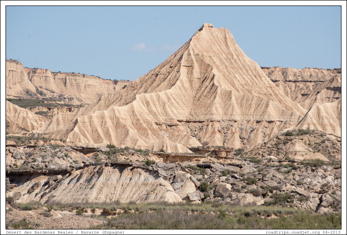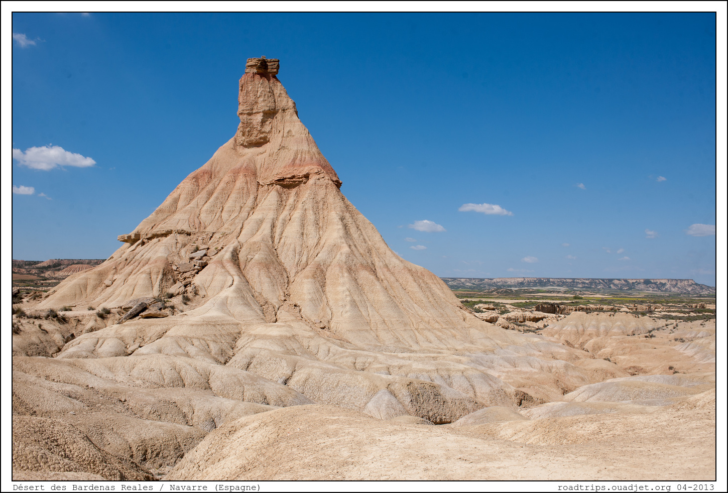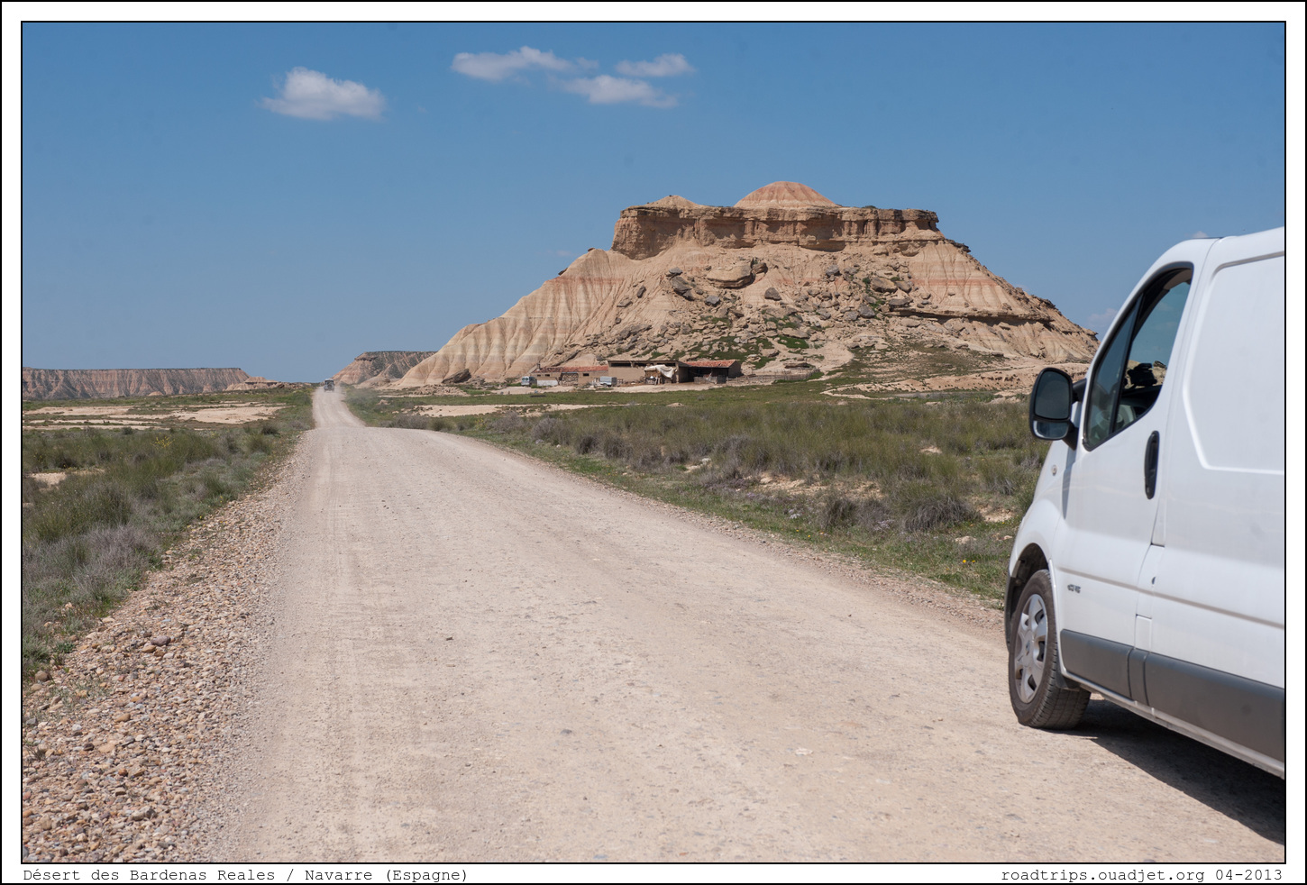 la dernière grosse étape de ce premier voyage en camion aménagé, c'est le désert des Bardenas Reales, une zone semi-désertique d'une superficie de 42 000 ha situés au sud-est de la Navarre, entre Tudela et Carcastillo. Cette réserve naturelle présente une végétation particulière ainsi que des formations rocheuses impressionnantes dues à l'érosion (bon malheureusement qui dit 'réserve naturelle' dit "On peut pas dormir dedans..." !). C'est une des plus vastes zones désertiques de la péninsule ibérique. Il n'y a quasiment pas d'habitants et les routes se composent essentiellement de pistes qui s'entrecroisent de façon anarchique.