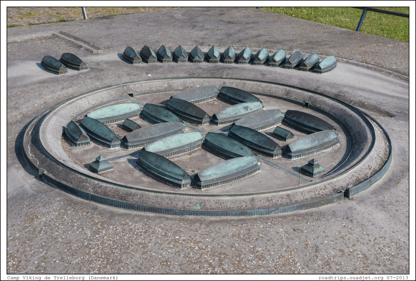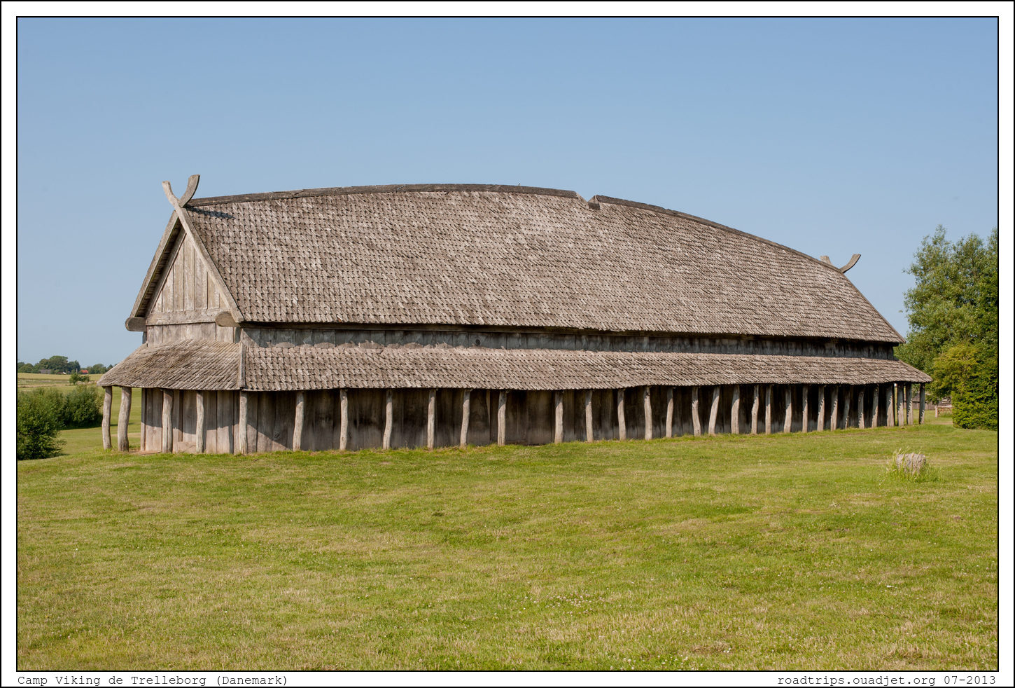 Seconde étape de la journée, le camp Viking de Trelleborg. Trelleborg est l'une des six forteresses circulaires vikings découvertes avant 2007. Située sur une péninsule formée par deux rivières non loin de Slagelse, sur l'île danoise de Seeland, elle a été transformée en musée archéologique en plein air. La fortification principale est un rempart parfaitement circulaire de 5 m de haut pour une largeur de 17,5 m à la base et un diamètre de 137 m, entouré d'un large fossé. Ce cercle est divisé en quatre sections égales par deux chemins à angle droit, qui aboutissent à quatre portes opposées. Chaque section est occupée par 4 maisons longues de 29,4 m disposées en carré. Un rempart supplémentaire barrait l'accès à la péninsule et protégeait une quinzaine d'autres maisons longues. Plus de 1 300 guerriers, certains avec femme et enfants, étaient casernés dans ce village en prévision de leurs invasions d'outre-mer.