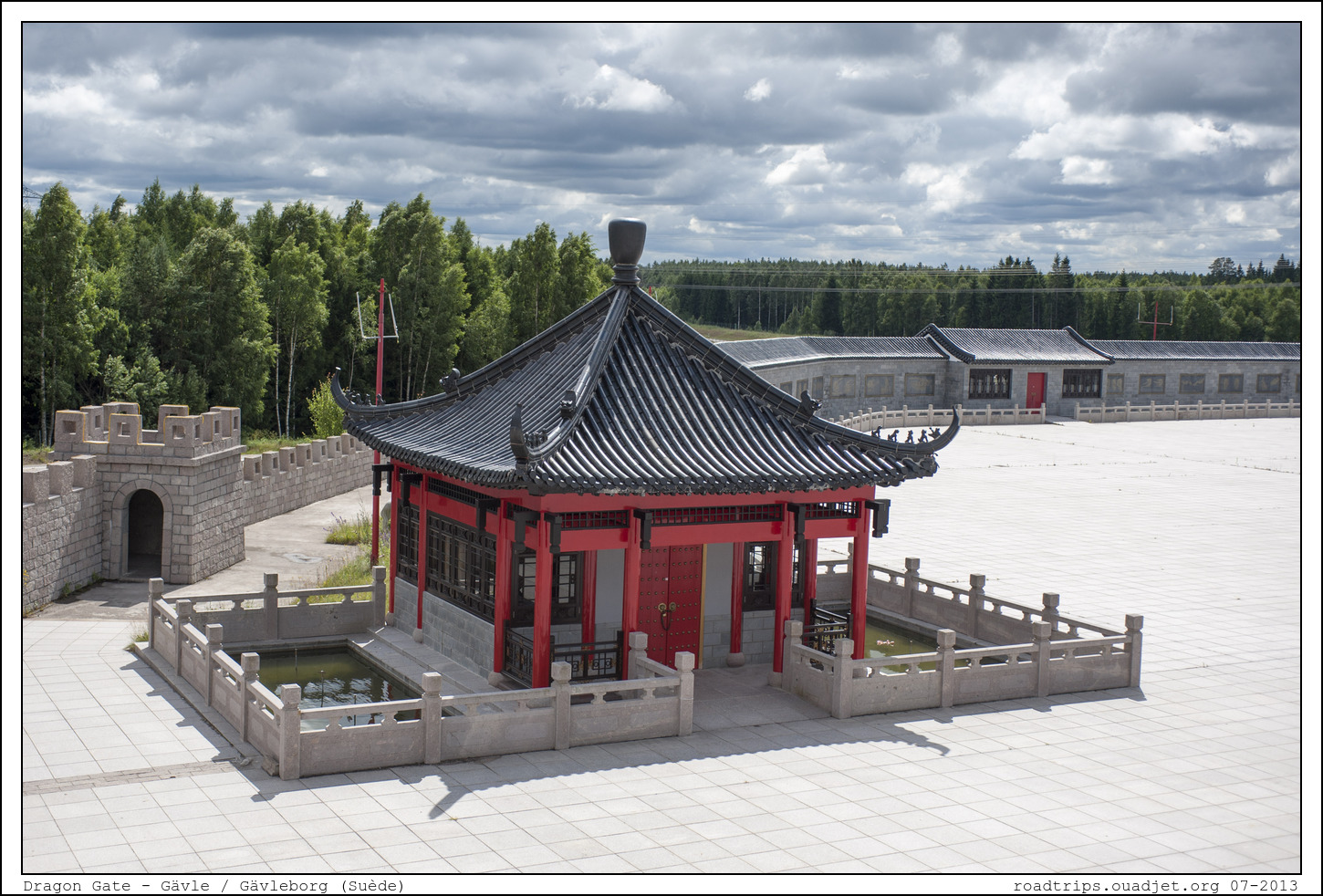 Nous avons repris la direction du Nord ce matin. Mais notre regard est soudain atiré par une construction qui détone vraiment. Comme un fort chinois perdu dans la plaine scandinave. Renseignement pris, c'est un projet surprenant d'un homme d'affaire chinois qui voulait mettre en place un point de rencontre entre culture asiatique et suédoise. La construction a débité en 2004 et a ouvert ses portes en 2008. l'endroit est étrange, il y a un musée, un commerce et un hôtel qui lui semble fermé... Ca ressemble à un projet qui a mal tourné mais nous ne regrettons pas la halte.