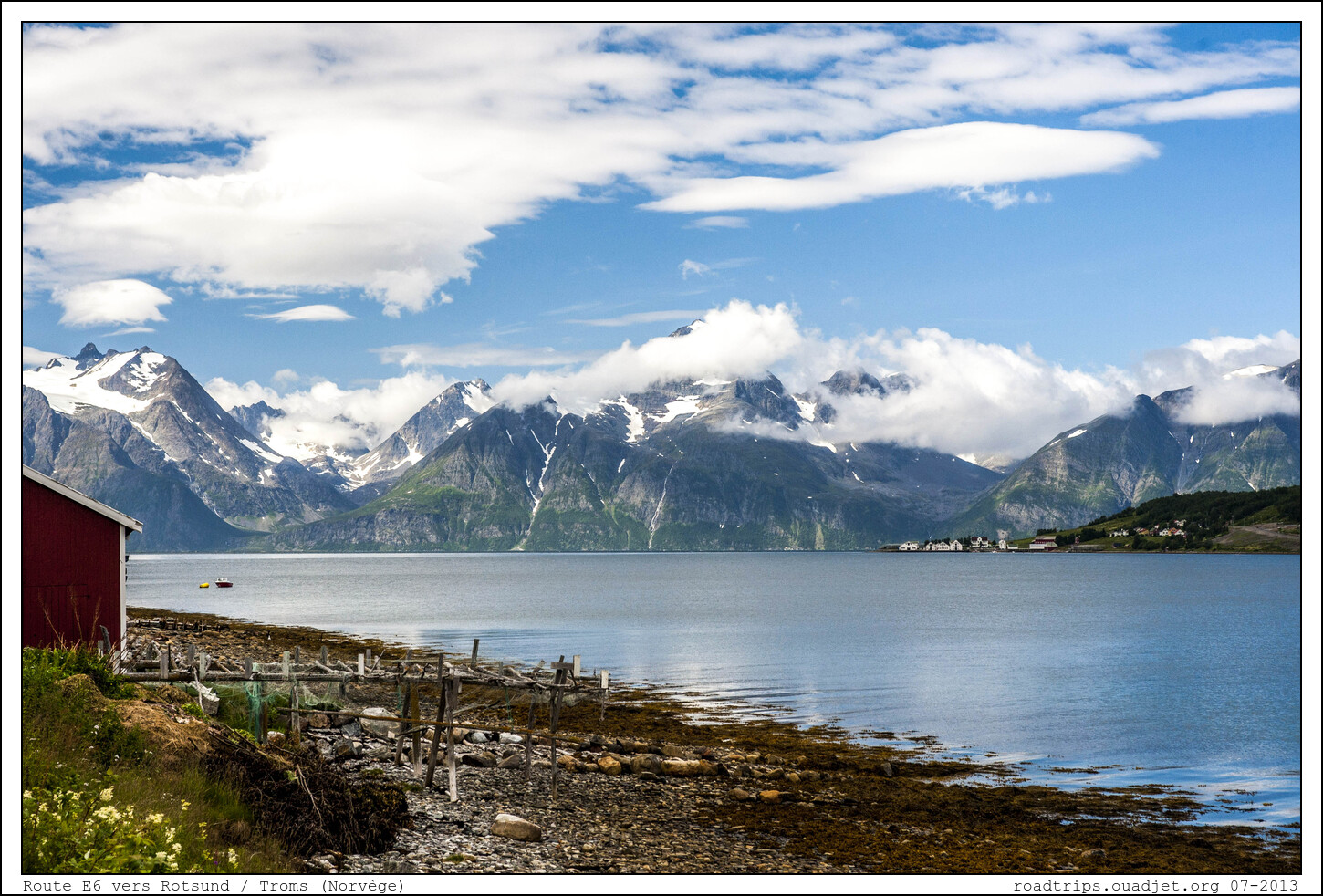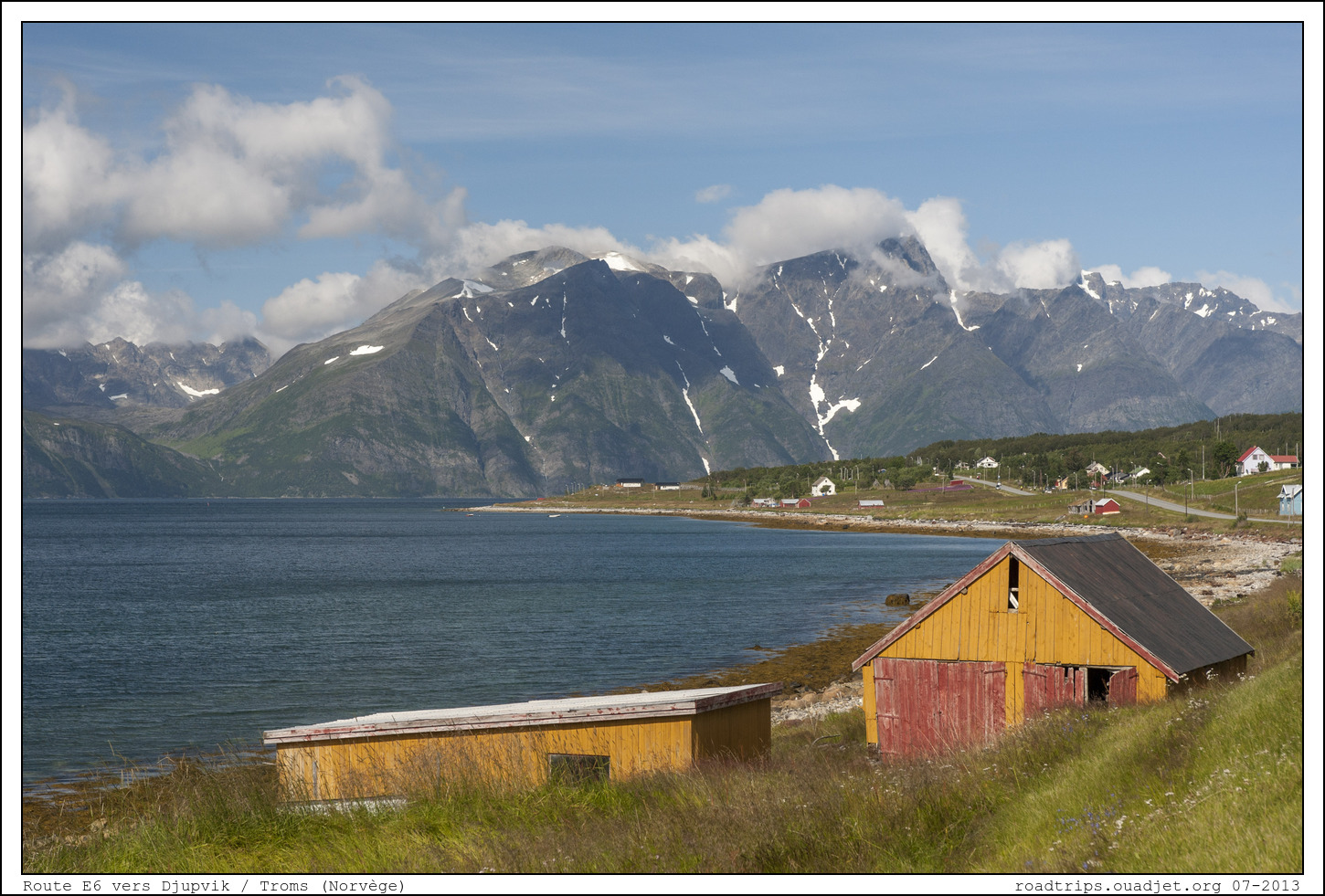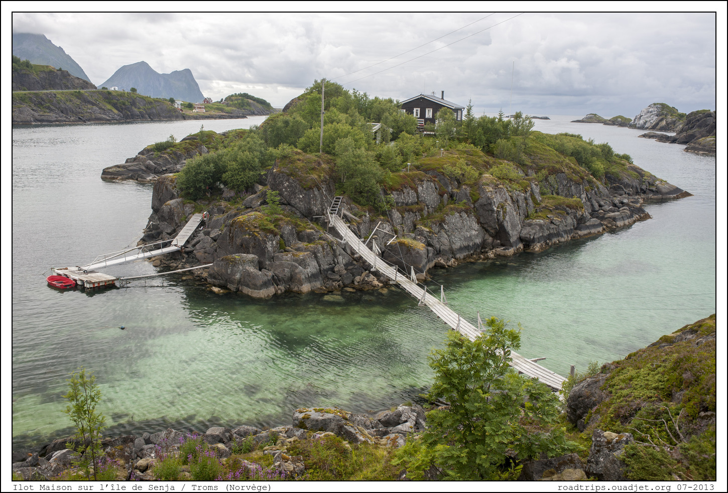 Nous passons l'après midi sur l'ile de Senja. Senja (pronc. Sènya) est la deuxième île de Norvège par sa superficie (le Svalbard mis à part avec 1 586 km2. Senja est connue pour ses paysages variés qui l'ont fait surnommer « une Norvège en miniature ». On est frappé lorsqu'on l'approche par ses montagnes spectaculaires qui plongent dans la mer, mais aussi par sa ceinture d'îles idylliques et par ses belles plages de sable. Sur la côte intérieure on trouve des terres fertiles et un paysage agréable et vallonné avec des forêts de bouleaux. Malheureusement la mété n'est pas très clémente cet après midi...