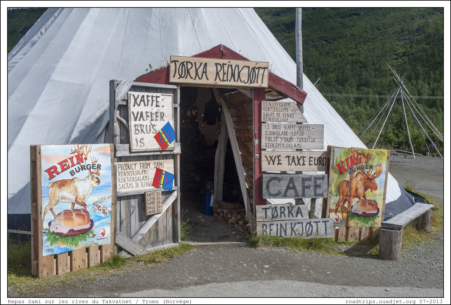 Pour la pause Midi, on se lance à la découverte de la cuisine Saami. Les bases en sont le poisson, le gibier, le renne et les baies sauvages. Bon et dépaysant car on a mangé dans la lavvu (tente) du patron. Sa conception est similaire à celle d'un tipi amérindien mais la lavvu est moins verticale, plus stable par vents forts et plus facile à monter et démonter que le tipi. Au milieu de la tente, un foyer assure le chauffage et repousse les moustiques. La fumée s'échappe par le haut de la tente qui reste généralement ouvert. Au besoin une couverture enroulée autour du trou de fumée réduit l'ouverture, mais jamais au point d'empêcher la fumée de s'échapper. La bonne circulation de l'air est maintenue en laissant une ouverture au ras du sol ou en laissant la porte entrouverte. Il faut que le feu soit suffisamment chaud pour que la fumée s’élève à travers le trou de fumée.
