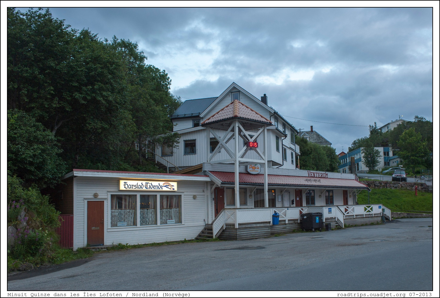 On atteint les iles Lofoten en toute fin de soirée (on commence a retrouver la notion de soirée même si les nuits restent très claires, il est minuit 15 sur la photo et la luminosité est celle d'origine). À Svolvær, le jour polaire se produit du 25 mai au 17 juillet, et la nuit polaire du 4 décembre au 7 janvier. Pour le moment toutes les iles que nous visitons disposent de ponts, nous n'avons pas pris un seul ferry.