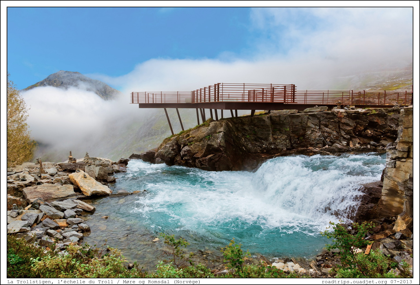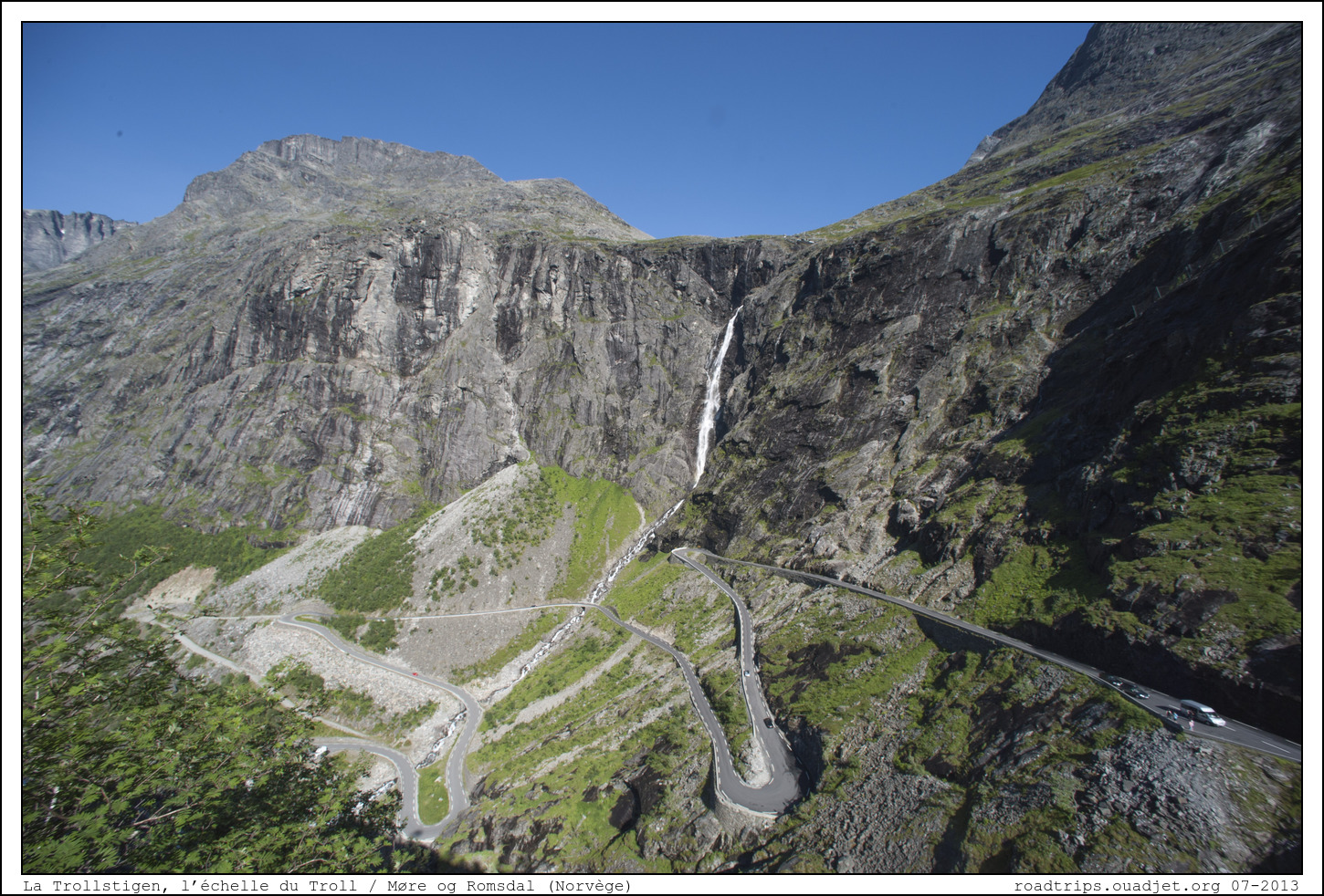 Dans l'après midi on grimpe l'incontournable Trollstigen, l'échelle du Troll. La route présente un fort dénivelé, soit 9 %, et onze virages en épingle à cheveux sur un versant très raide de montagne. La route est très étroite avec beaucoup de courbes serrées et bien qu'elle ait été élargie ces dernières années, les véhicules de plus de 12,4 mètres de long y sont interdits à la circulation.