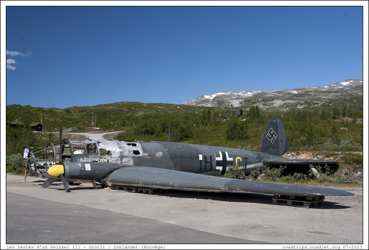 Au passage à Grotli, point de départ de la 258, on tombe sur l'épave d'un Heinkel 111. Après quelques recherches on a trouvé que c'était une réplique faite pour un film qui a été tourné sur place, 'Into the White'. Du coup j'ai regardé le film et il est excellent (comme souvent les excellents films demeurent inconnus). Je le rapprocherais de 'Un taxi à Tobrouk' pour le côté réflexion sur la guerre quand des gens de camps opposés se retrouvent ensemble dans la galère. C'est tiré d'une histoire vrai (Des pilotes qui se sont crashés en pleine montagne après un combat aérien où chacun à dégommer l'avion de l'autre) et c'est très bien filmé et très bien interprété.