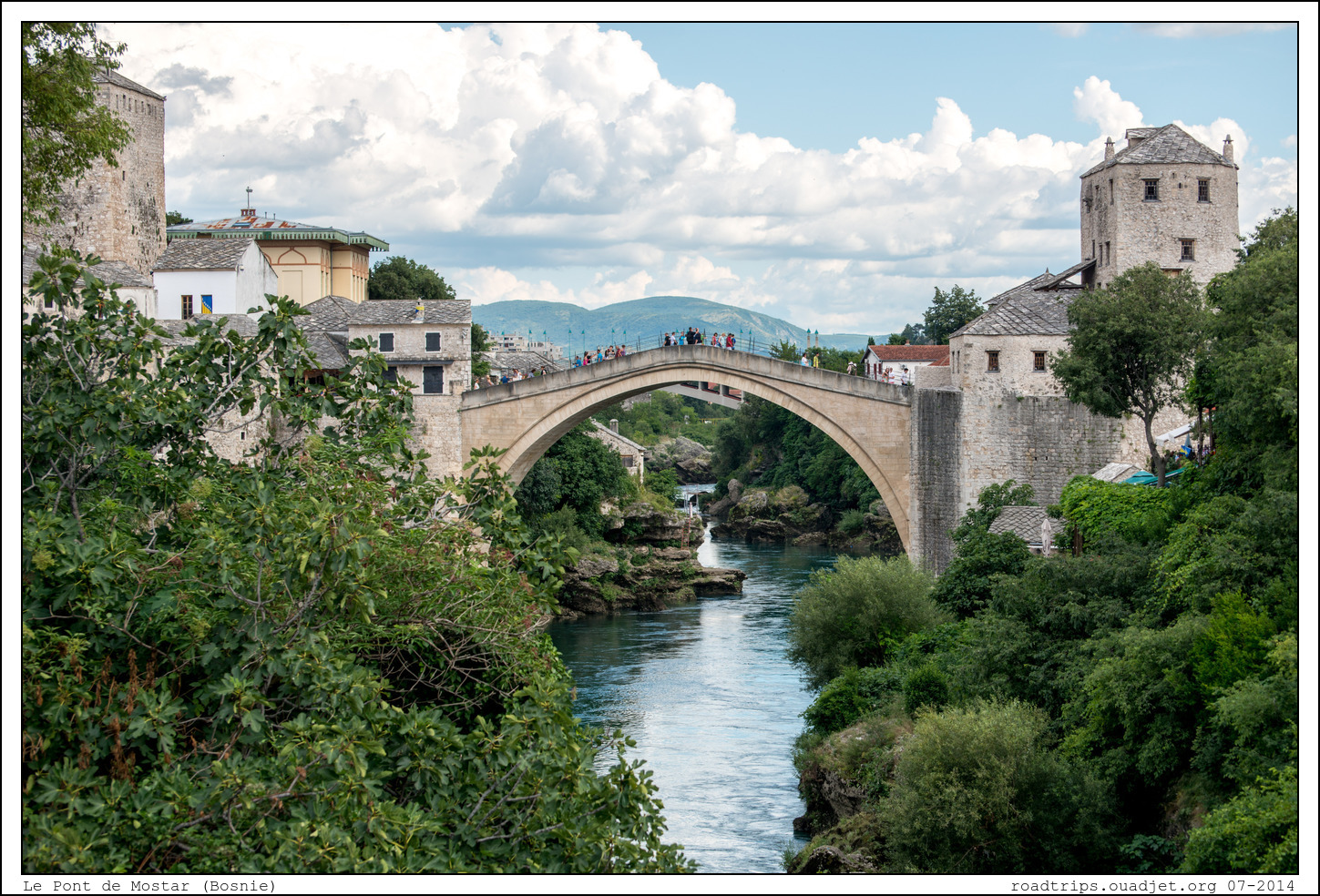 Nous allons ensuite à Mostar, ville célèbre pour son pont. Depuis 2005, le « Quartier du Vieux pont de la vieille ville de Mostar » est inscrit sur la liste du patrimoine mondial de l'UNESCO. Le Stari Most (« le vieux pont » en bosnien) de Mostar est un pont du 16ème siècle qui relie les deux parties de la ville. Le Vieux Pont fut construit en 1565 par l’architecte ottoman Mimar Hayreddin. Il est constitué d'une seule arche en dos-d'âne de 27 m de portée, 4 m de largeur et 29 m de longueur. Il domine la Neretva d’une hauteur de 29 mètres. Deux tours fortifiées le protégeaient.
