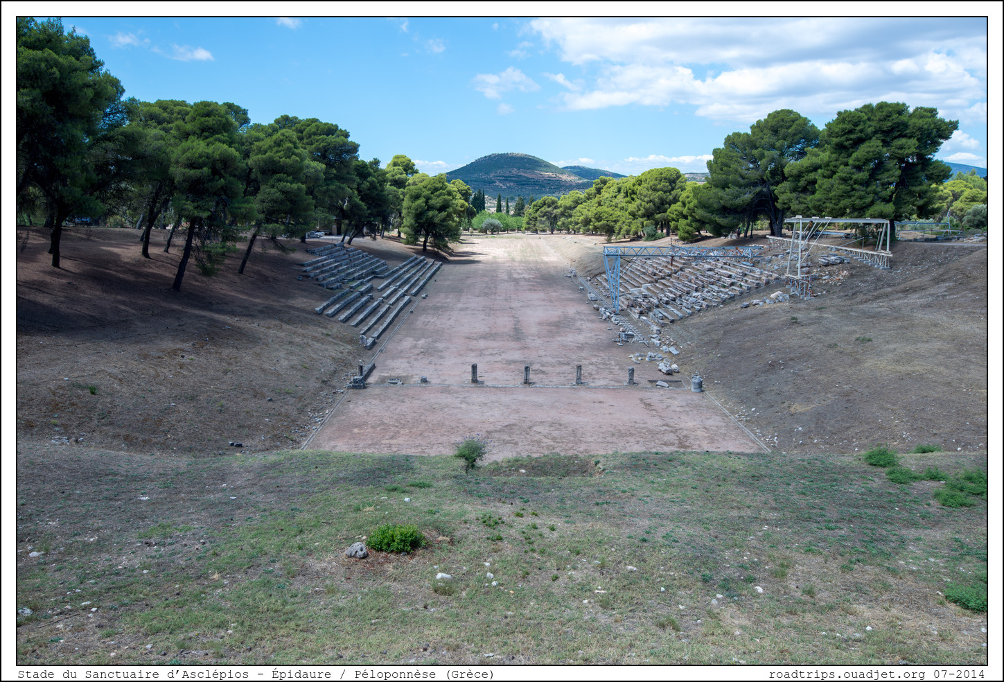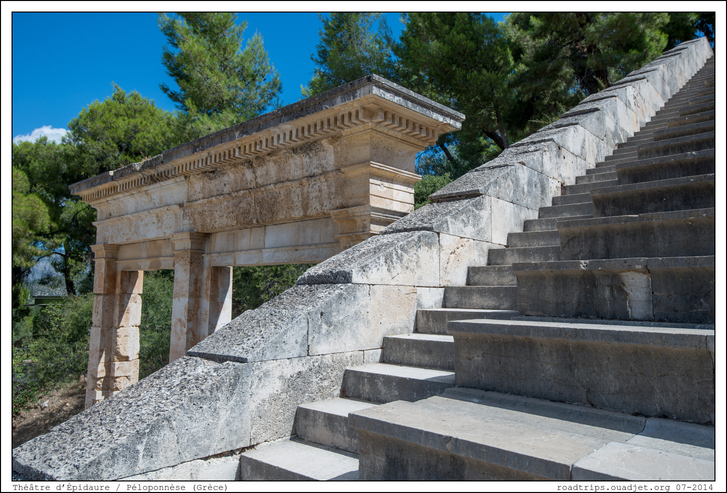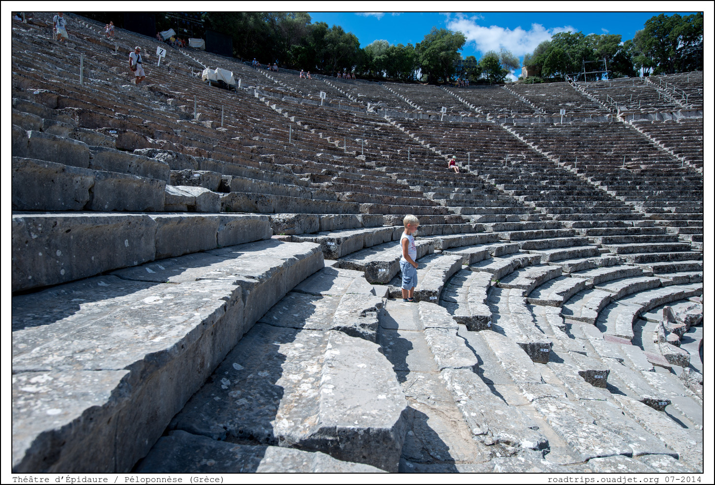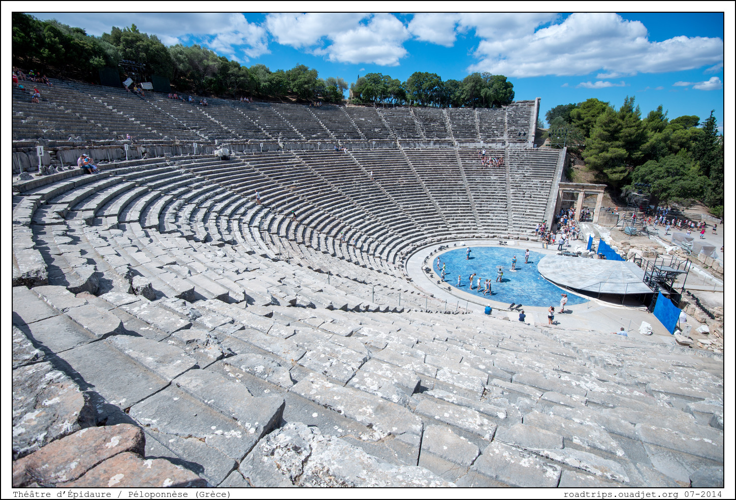 Construit vers 350 avant JC à flanc de colline, à cinq cent mètres du sanctuaire, le théâtre d'Épidaure fut rehaussé de 21 rangées de gradins par les Romains au 2ème siècle avant JC et pouvait accueillir 12000 spectateurs. En forme d’hémicycle, ou plus précisément de portion de cône, il est remarquable par ses proportions harmonieuses qui ont été beaucoup étudiées notamment pour leur rapport avec le nombre d’or. Les spectateurs prennent place sur des gradins de marbre blanc, le koilon ou theatron, séparés en secteurs par des escaliers.