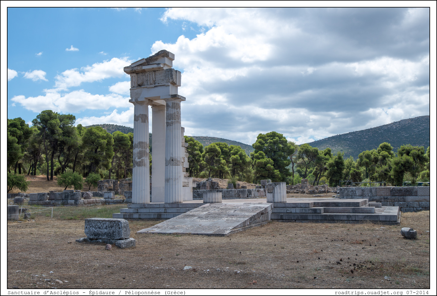 Le sanctuaire d’Épidaure comprenait de nombreux monuments. Dans l’espace sacré, délimité par des bornes, il était interdit de naître ou mourir. Il s’organisait autour du grand temple d’Asklepios (24x13m), peut-être construit par l’architecte Théodotos au début du 4ème siècle avant JC, aujourd’hui en ruines. Il comportait également d’autres temples (Apollon, Artémis, Aphrodite et Thémis).