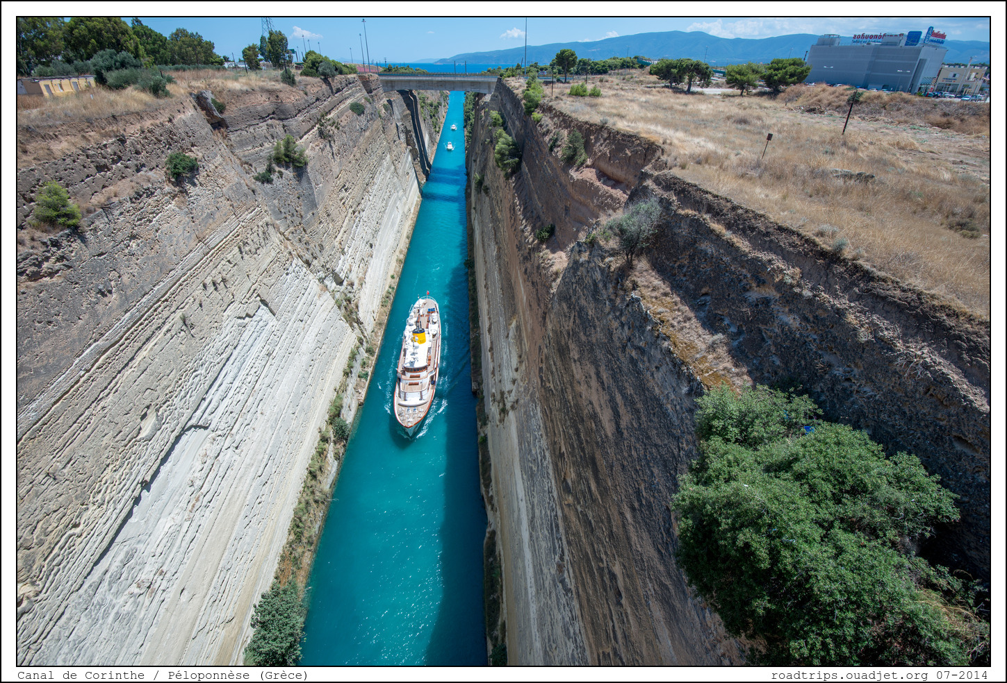 Le canal de Corinthe est une voie d'eau artificielle de 6,3 Km creusée à travers l'isthme de Corinthe pour éviter d'avoir à contourner le Péloponnèse (soit un détour de 400 Km). Dès le 7ème siècle avant JC, il existait un chemin de bois pour le roulage des navires. La première tentative de construction d'un canal à cet endroit est attribuée à Néron en 67, qui inaugura les travaux avec une pelle en or. L'année suivante, à la mort de Néron, son successeur Galba abandonne le projet, jugé trop onéreux. En novembre 1869, l'ouverture du canal de Suez amène le gouvernement grec à faire voter une loi sur l'ouverture de l'isthme de Corinthe. La mise en circulation a lieu en janvier 1894.
