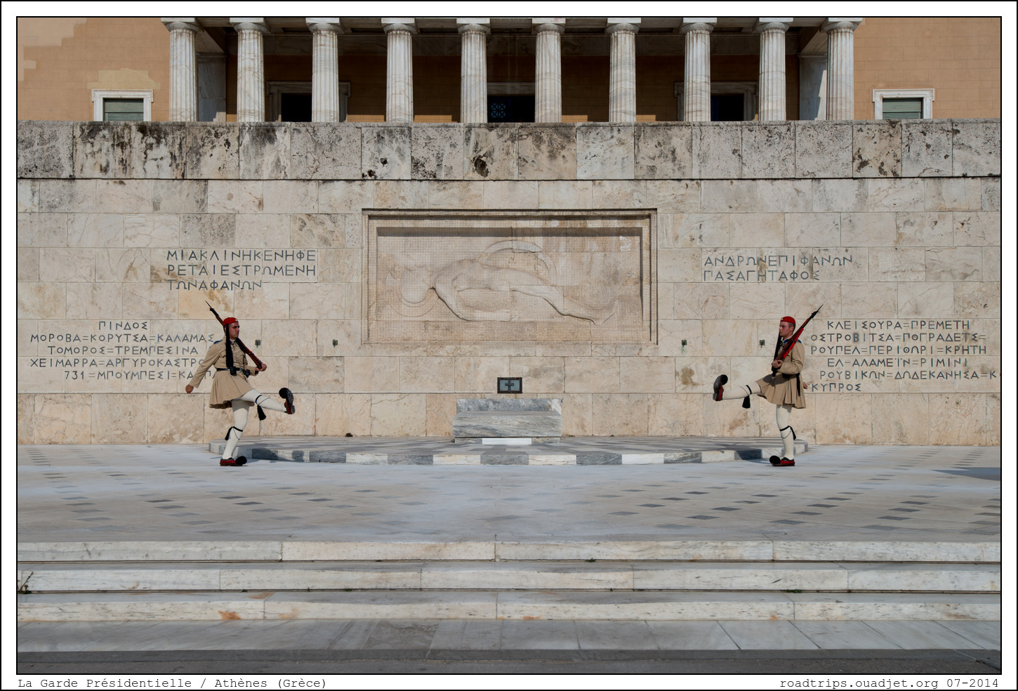 On arrive à Athènes en fin de journée, juste pour la relève de la garde ! La relève de la garde a lieu sur la Place Syntagma, au pied du Parlement hellénique, devant le monument du Soldat inconnu. On y voit les evzones, ces soldats qui portent des chaussures à pompons et une jupe à 400 plis (qui représentent les 400 ans d’occupation ottomane). Beaucoup sourient en voyant leur uniforme, mais ne vous méprenez pas, ces hommes font partie d’une unité d’élite. Ils sont rigoureusement sélectionnés en fonction de leur taille, de leur excellente condition physique et de leur moralité.