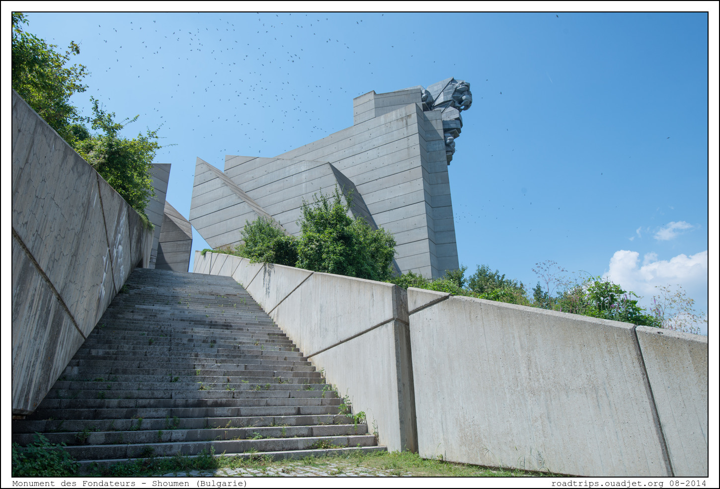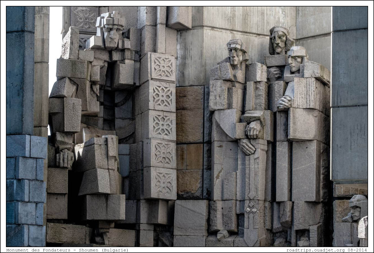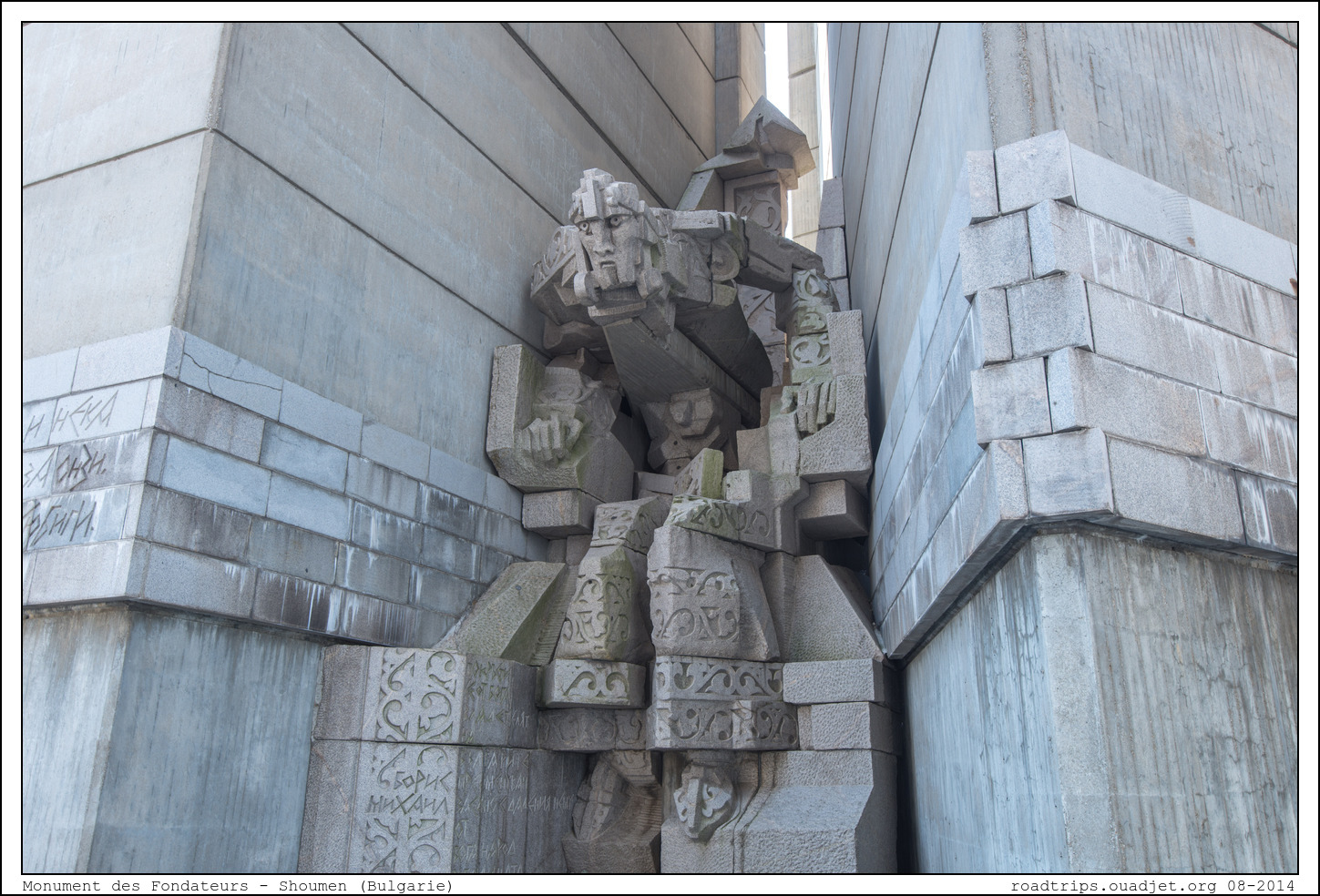 Les statues des empereurs bulgares, hautes de 18 m, ponctuent cet ensemble architectural tout en angles, dont la construction nécessita 50 000 m3 de béton et 2 500 tonnes d’acier. L’inscription sous la statue du khan Omourtag signifie peu ou prou “Même si un homme vit bien, il meurt un jour et un autre naît ; puisse celui qui nous succédera, lorsqu’il verra l’inscription, se souvenir de celui qui l’a faite”.
