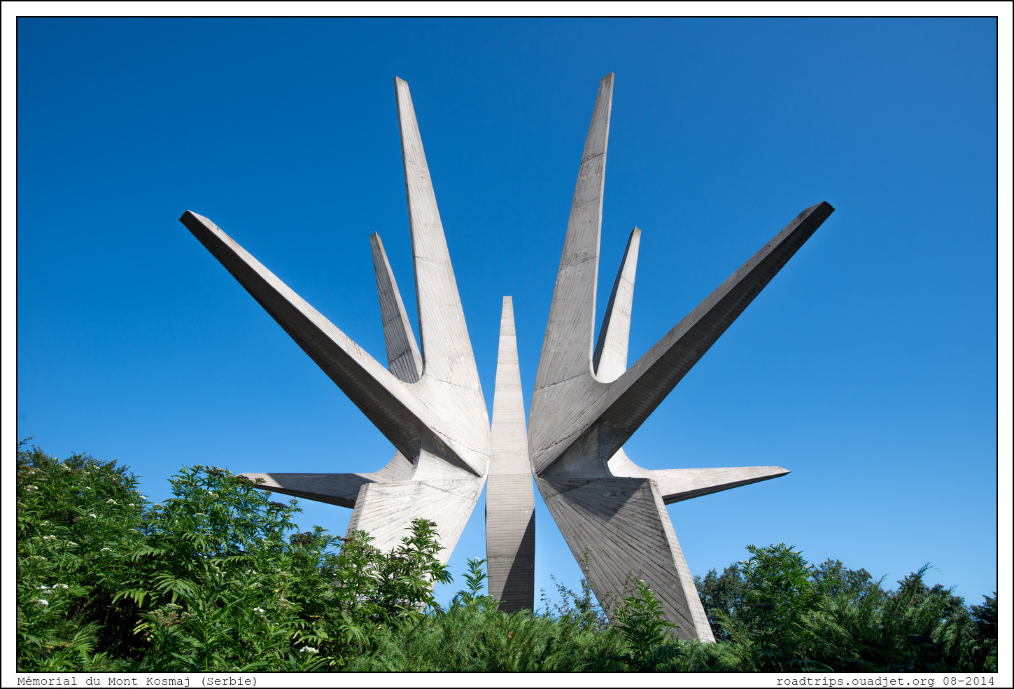 Le mont Kosmaj, 626 m, est le point culminant du district de belgrade. Nous y avaons passé une nuit tranquille. Deux monuments sont érigés au sommet du Kosmaj, l'un en l'honneur des soldats tombés pendant la Première Guerre mondiale, l'autre, celui de la photo, en l'honneur des Partisans communistes du détachement de Kosmaj tombés pendant la Seconde Guerre mondiale.