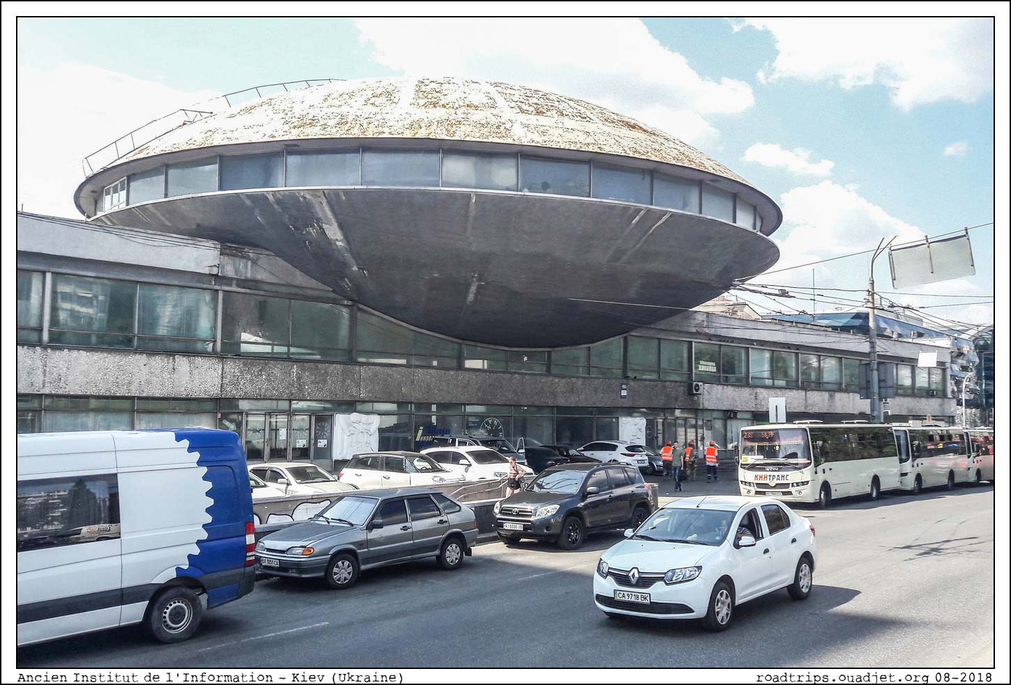 Après le repas de midi, on consacre l'après midi à la préparation de notre virée du lendemain sur Tchernobyl... Achat de vêtements d'occasion et choix d'un hôtel correctement placé à la bonne sortie de Kiev afin de ne pas perdre du temps dans les embouteillages. On passe devant l'ancien institut de l'information, un bâtiment conçu en 1971 par l'architecte et artiste Florian Yuryev qui montre le fascination des soviétiques pour les soucoupes volantes...
