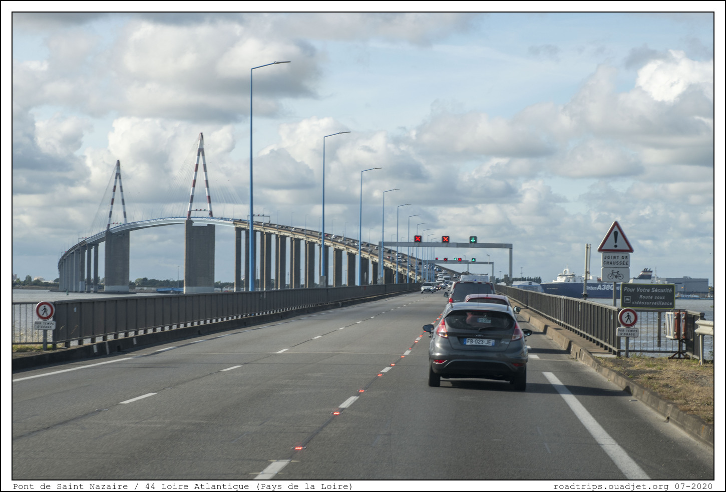 Après Pornic, cap à l'Ouest en passant par le pont de Saint-Nazaire. Inauguré en 1975, l'ouvrage métallique haubané mesure 720 m et l'ensemble des ouvrages, avec les viaducs d'accès, représente une longueur totale de 3 356 m, ce qui fait du pont de Saint-Nazaire le plus long pont de France. Payant un temps, il est devenu gratuit en 1994.