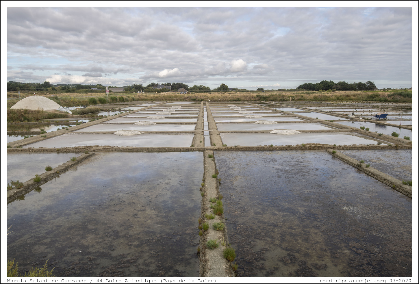 Nous visions en fin d'après midi les marais salant de Guérande. Les marais salants occupent la partie orientale d'une vaste zone plane dont l'altitude maximale ne dépasse pas 6 mètres, située entre le coteau de Guérande au nord et la presqu'île du Croisic au sud qui la sépare de l'océan Atlantique. On situe la construction des premières salines entre la fin de l'époque romaine et la période de la colonisation bretonne du 7ème siècle. En moyenne, les salines de Guérande produisent environ 10 000 tonnes de sel chaque année, production bien inférieure en quantité à celle, plus industrielle, des salines de la côte méditerranéenne telles que Salin-de-Giraud et Salins-d'Hyères.