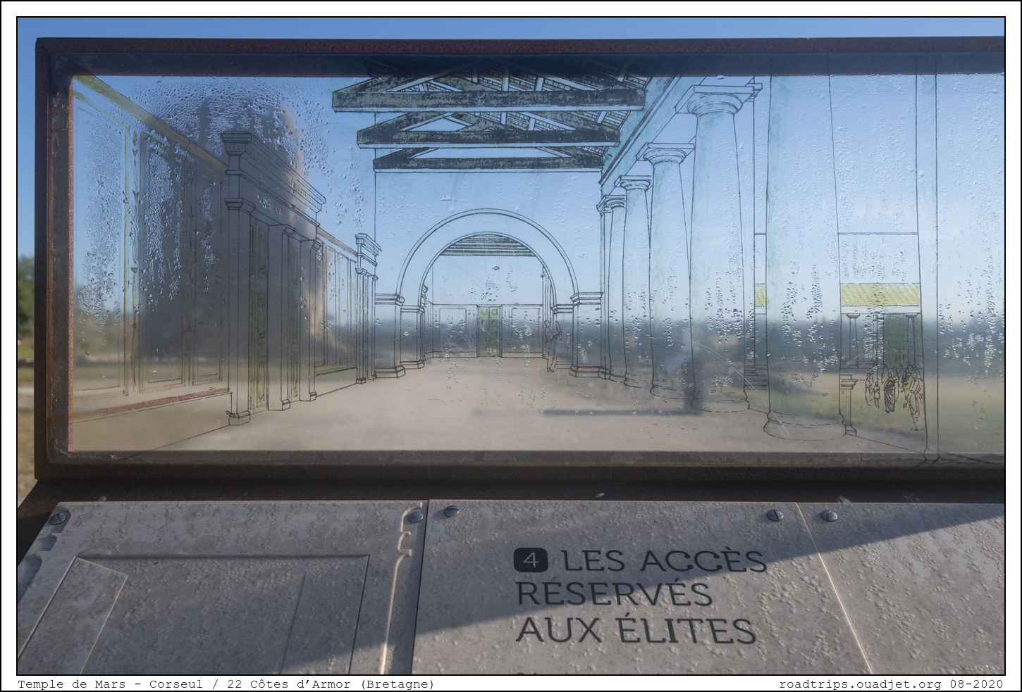 Puisque nous sommes sur place, nous avons pu visiter le site romain en toute tranquillité. Il y a des panneaux transparents de ce type qui permettent d'imaginer facilement ce que donnaient les bâtiments à partir des ruines visibles. Le sanctuaire, temple romain de tradition gauloise, fut vraisemblablement construit vers le milieu du 1er siècle apr. J.-C.. Il fut utilisé jusqu'à la fin du 3ème siècle. Les dimensions de ce temple en font l'un des plus vastes sanctuaires de toute la Gaule. Son attribution au culte de Mars reste à confirmer.